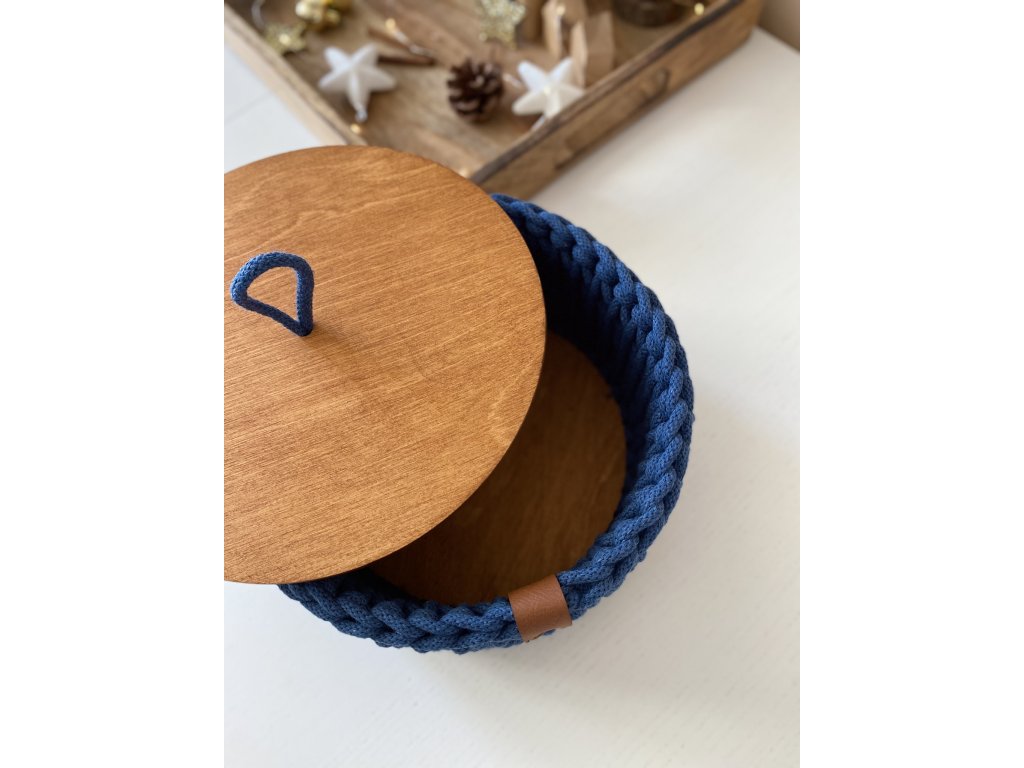 Dřevěné víčko chrání obsah košíku před prachem a nečistotami a zároveň zajišťuje snadný přístup k uloženým předmětům. Košíky jsou lehké, snadno přenosné a díky kulatému tvaru se snadno vejdou do různých prostor.
