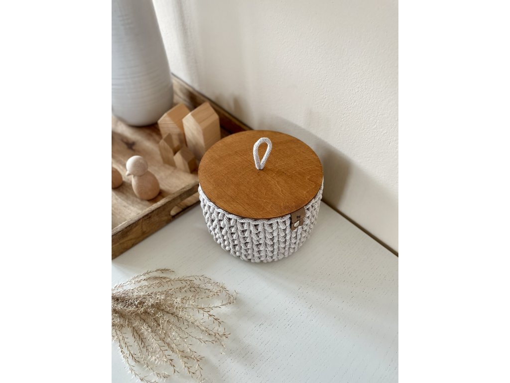 Kulaté háčkované košíky s dřevěným víčkem jsou ideální pro ukládání drobností, které na první pohled způsobují nepořádek nebo by se mohli snadno ztratit.
